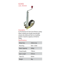 AL-KO Premium 8” Semi Auto Retract Jockey Wheel. Winding the handle automatically retracts the wheel and fork to a travelling position. Dynamic capacity is limited to 300kg.